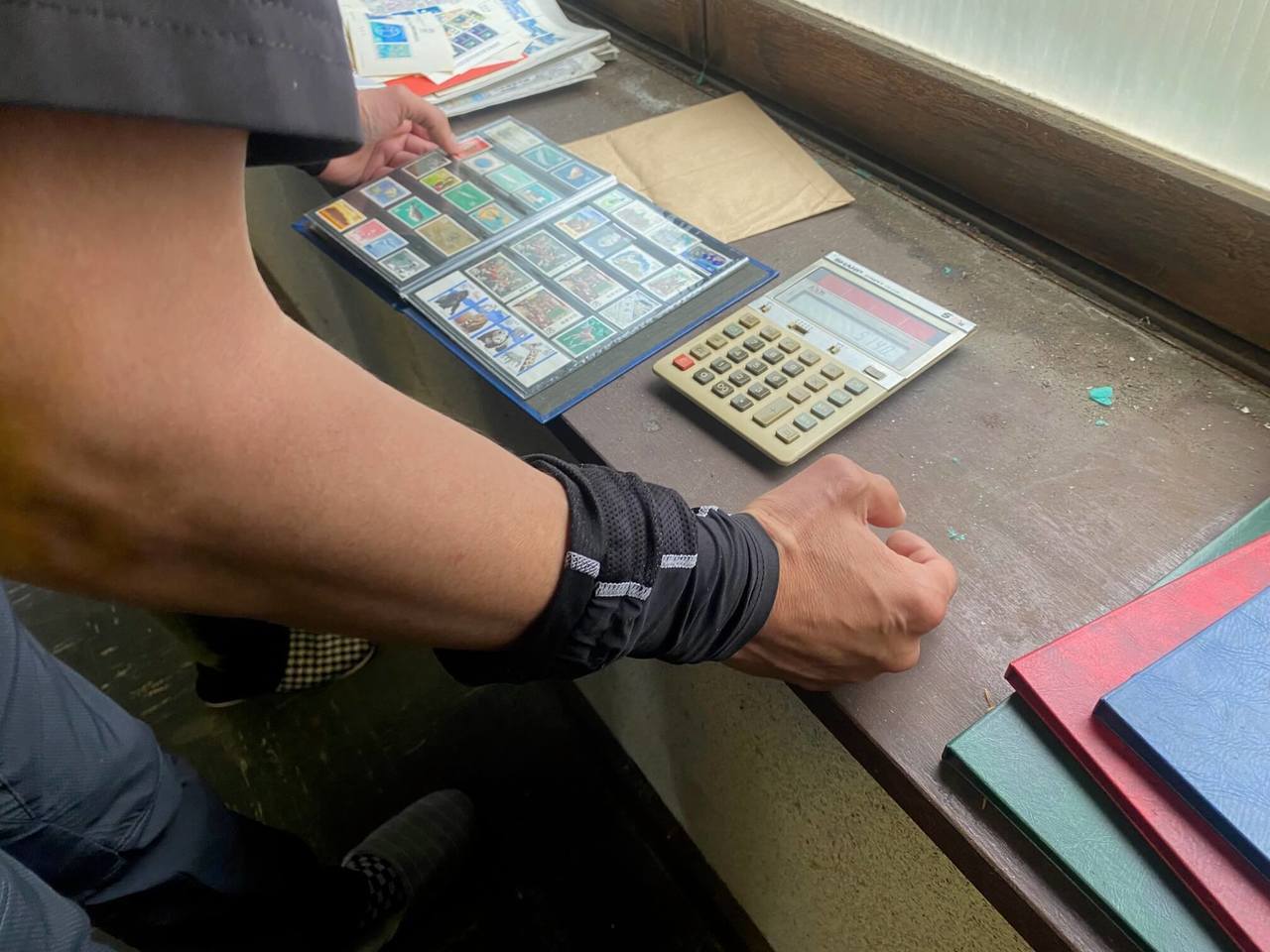 切手の買取査定中のお写真です。切手の買取相場は、切手に印刷されてある数字を足した金額の約半分が買取金額になります。今回は足した数字が8000になりましたのでその半分の4,000円を買取査定額と算出し現金にてキャッシュバックさせていただきました。